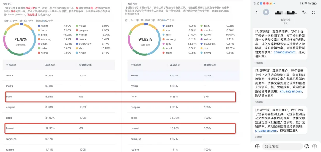创蓝一直关注企业的投放效率,基于百亿级短信训练的对抗模型及策略,我们加大投入重装上线了闪测Plus版本,覆盖市面上的主流机型,为企业主提供免费的短信内容检测工具。在每次营销活动前,通过提前检测活动文案在各手机终端的到达率。减少“空投”、提高效率!